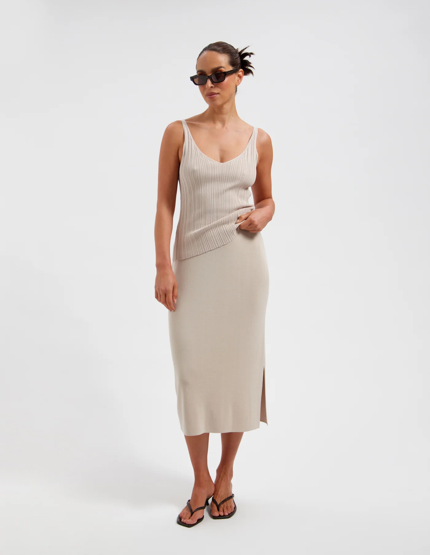 De AMBER van AVEC ELAN. Deze verfijnde rib gebreide top in een zachte zandkleur heeft een elegante V-halslijn en smalle bandjes voor een vrouwelijke, minimalistische uitstraling. De blend van 70% viscose en 30% polyamide zorgt voor een soepele, lichtgewicht feel met subtiele stretch. Draag solo op warme dagen of laag onder een blazer voor een gelaagde, sophisticated look. Shop nu jouw nieuwe veelzijdige essential!