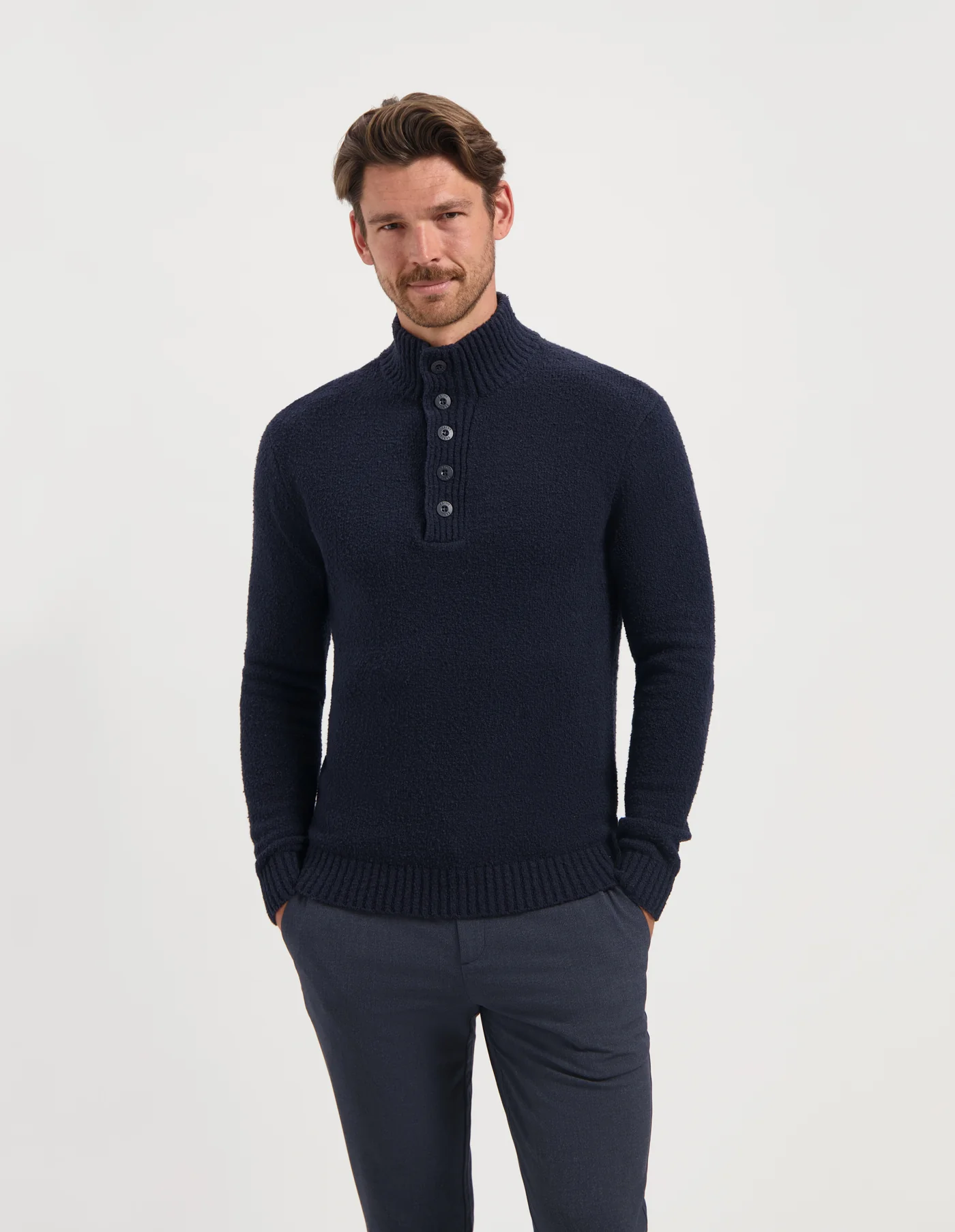 De ANDY is een stijlvolle knit met een opstaande ribkraag en knoopsluiting die zorgt voor een sportieve en eigentijdse uitstraling. Deze trui is gemaakt van een mix van katoen, polyamide en elastaan en heeft een zachte structuur met subtiele textuur. Dankzij de comfortabele pasvorm is het een ideale keuze voor dagelijks gebruik. Combineer ‘m met een jeans of nette broek voor een moeiteloze look, shop de ANDY nu bij ANTRACITE!