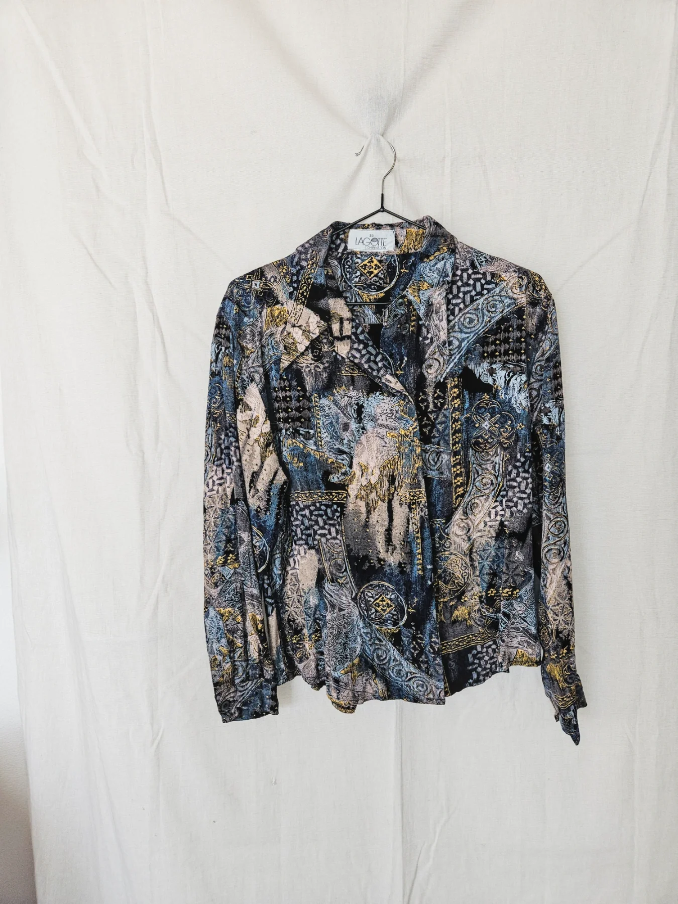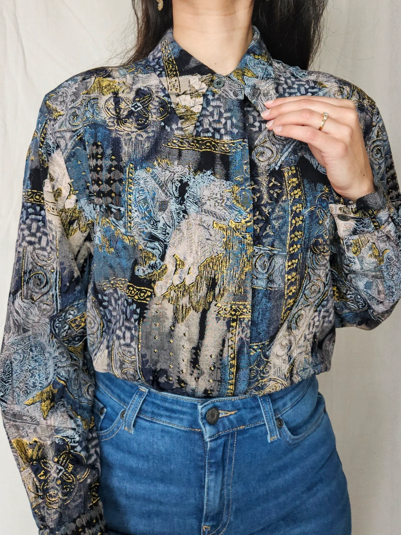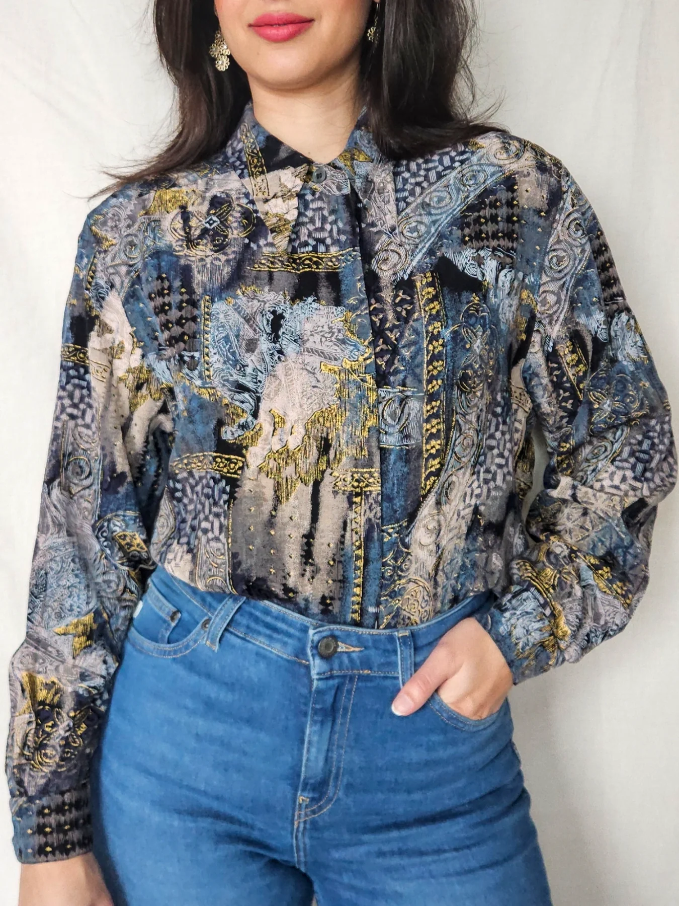 Deze vintage blouse bevat prachtige tekeningen en kleuren met stukjes goud er doorheen. Opvallend zijn de spitse 70s kraag en de weggewerkte knopen, waardoor dit geen doorsnee blouse is. Het materiaallabel ontbreekt, maar het lijkt een viscose stof met lichte stretch.