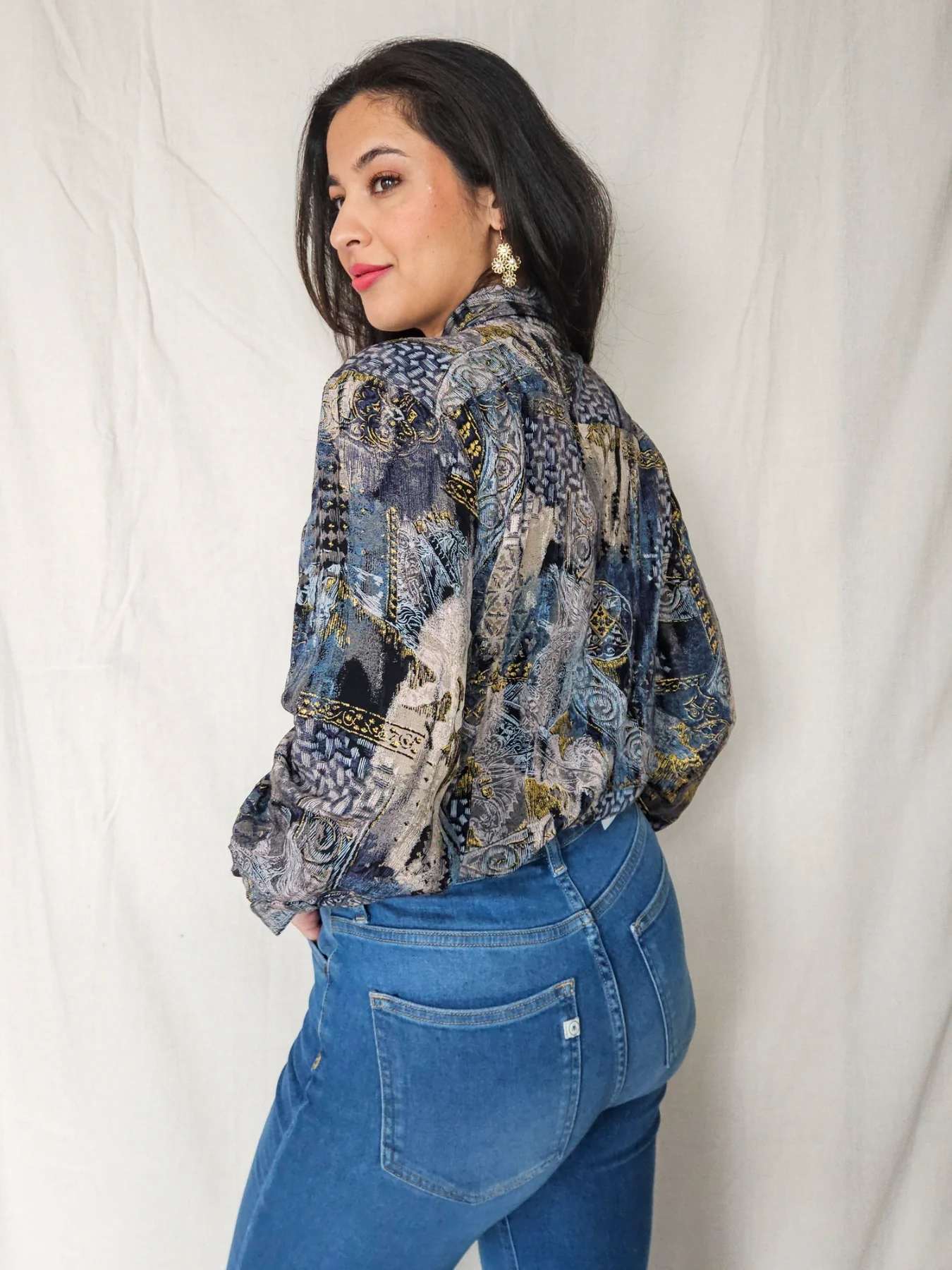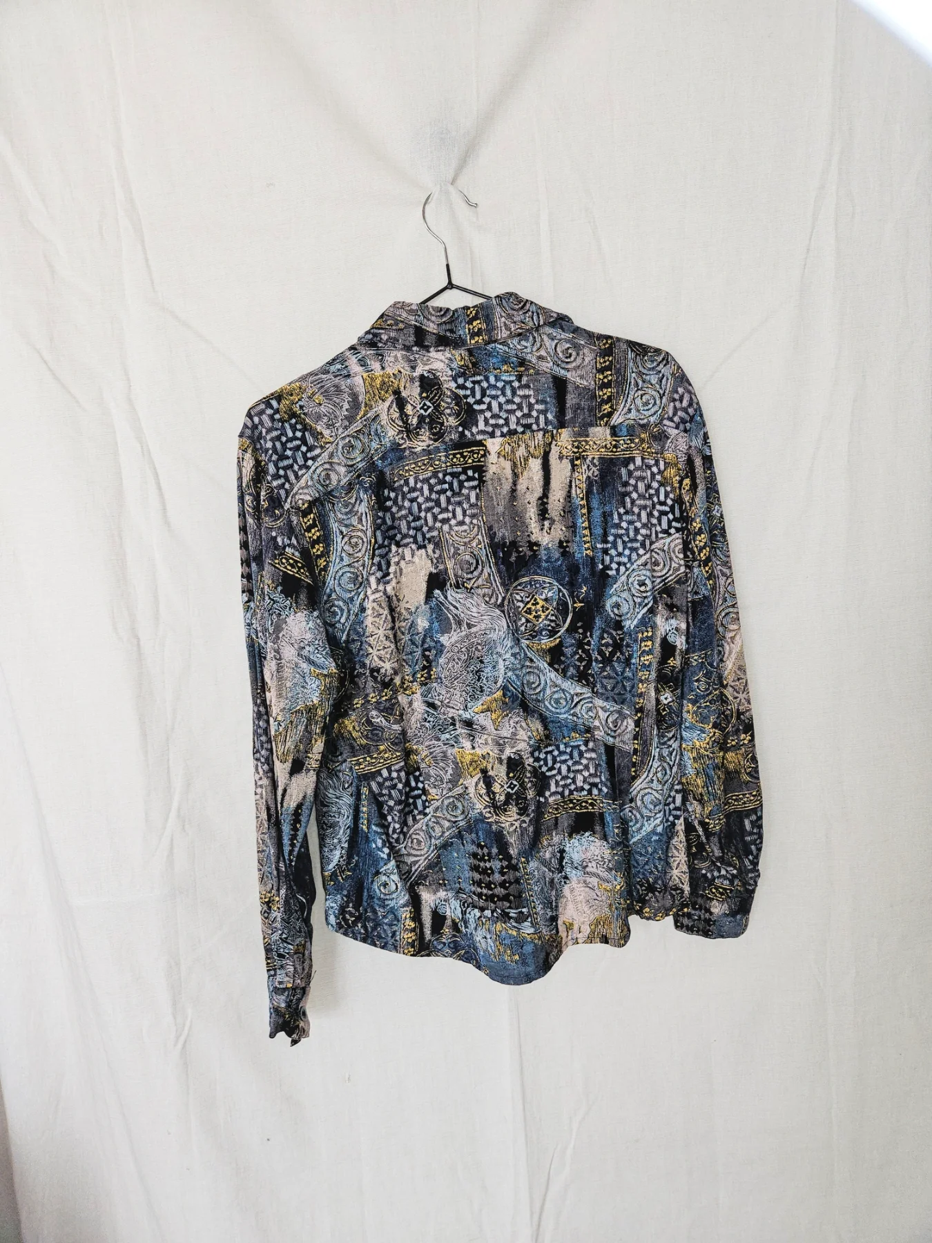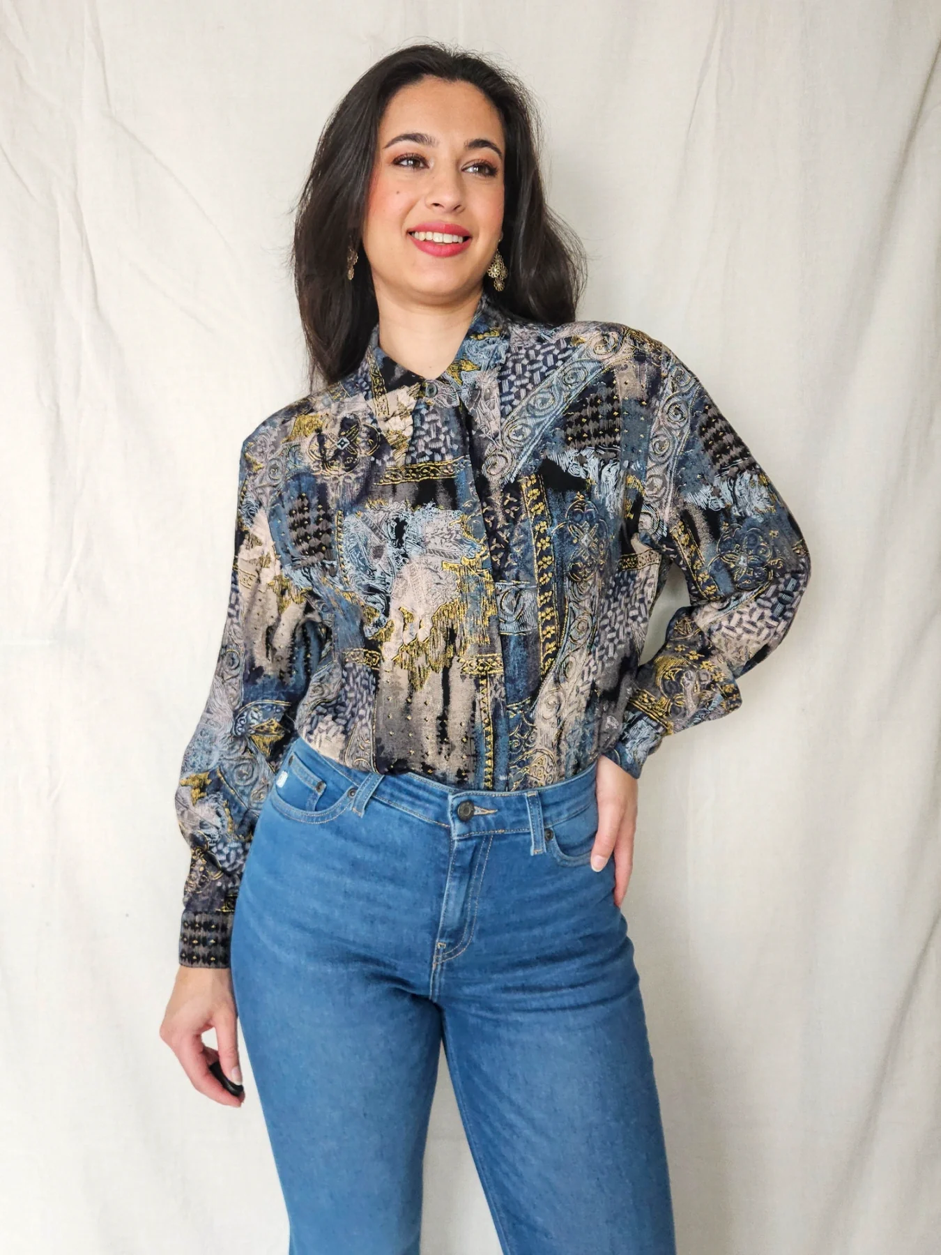 Deze vintage blouse bevat prachtige tekeningen en kleuren met stukjes goud er doorheen. Opvallend zijn de spitse 70s kraag en de weggewerkte knopen, waardoor dit geen doorsnee blouse is. Het materiaallabel ontbreekt, maar het lijkt een viscose stof met lichte stretch.