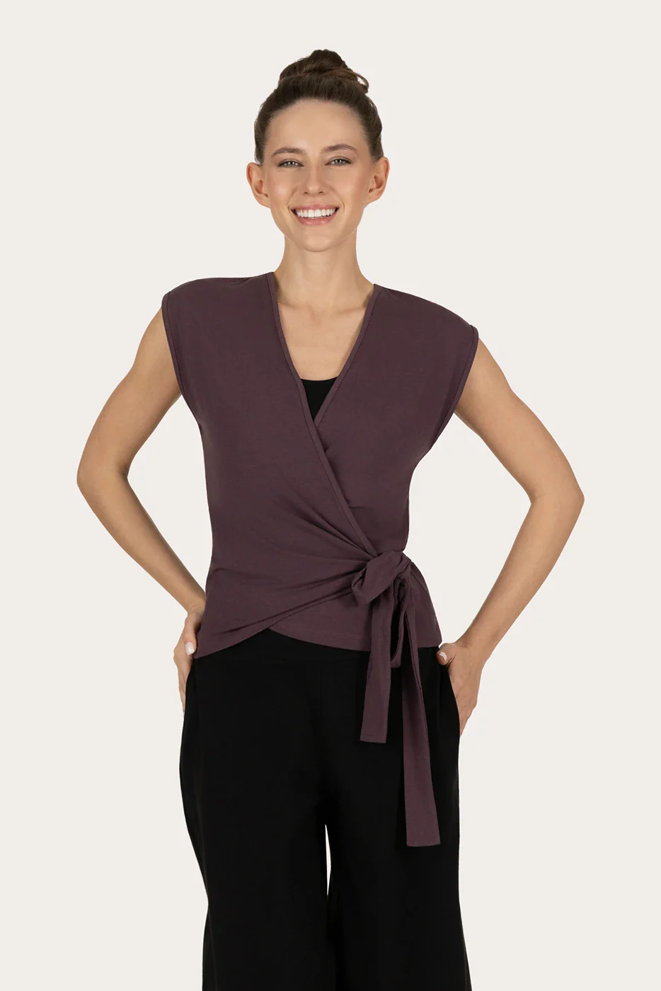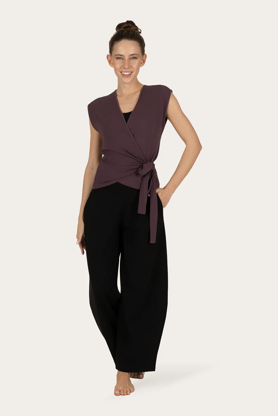De Aurora Wrap Yoga Top is een vrouwelijke wikkeltop van zachte bamboe en biologisch katoen. De soepele stof beweegt met je mee en voelt heerlijk licht aan. Met een flatterende fit en verstelbare tailleband is deze top perfect voor yoga, pilates of casual layering.