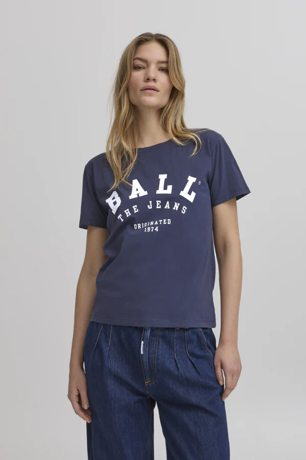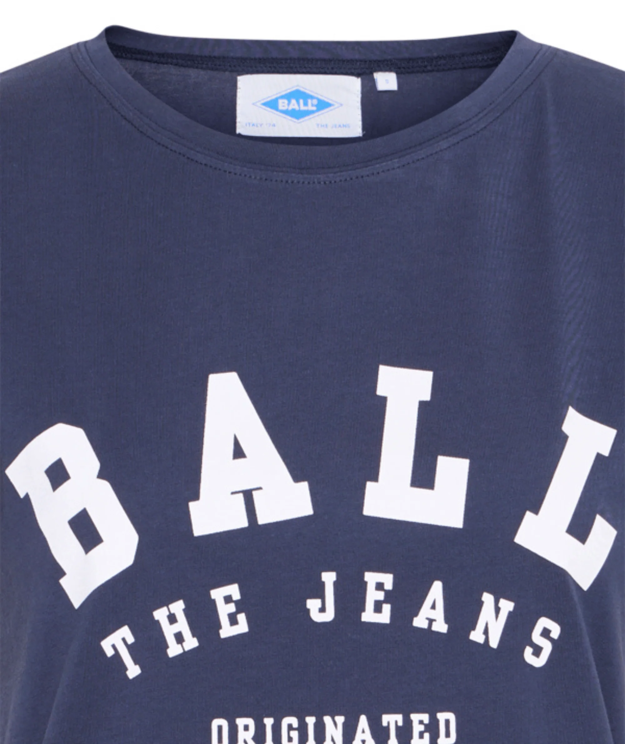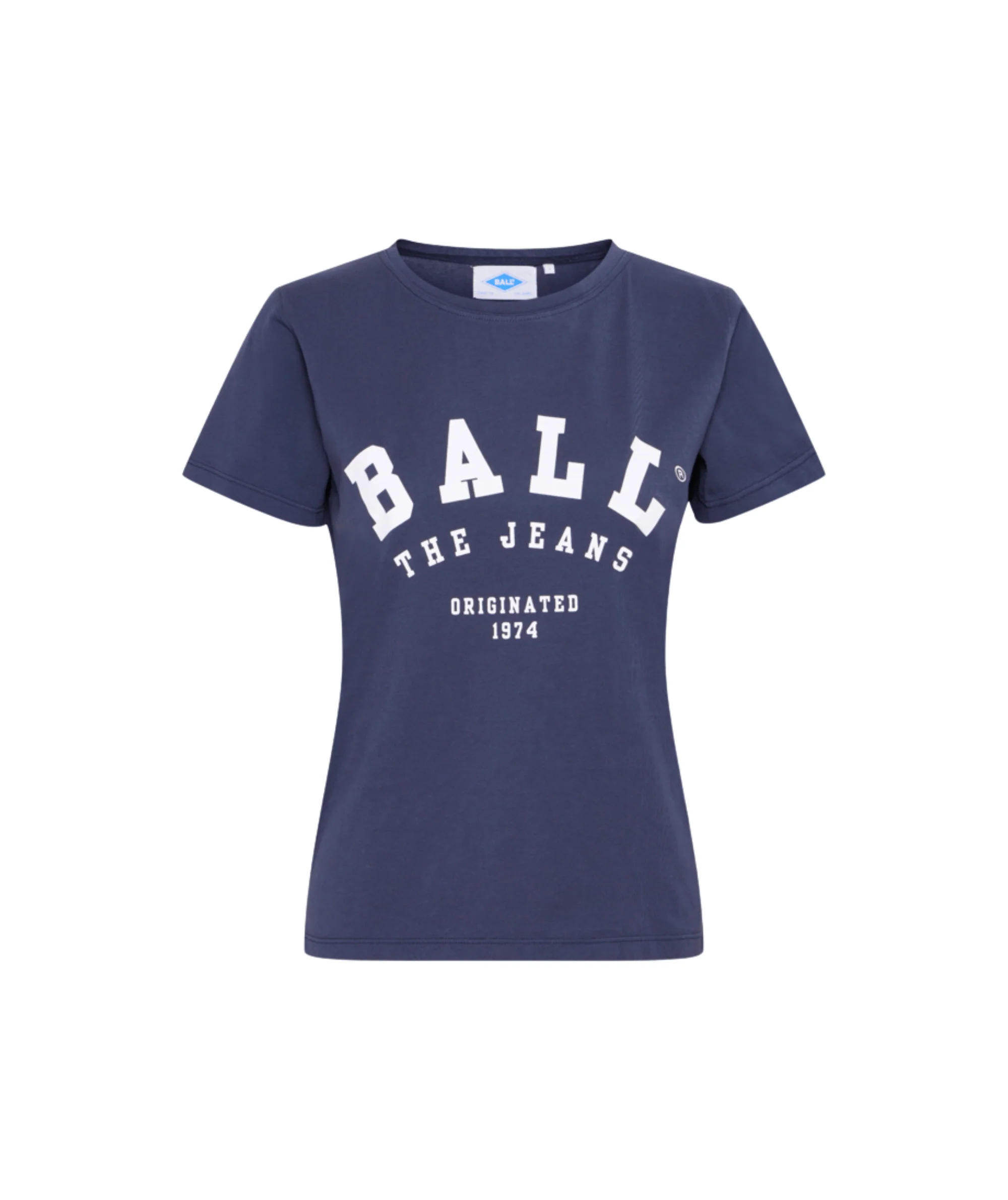 Ga voor een stijlvolle look met het BAMALDINI T-shirt voor dames van BALL. Di donkerblauwe T-shirt van BALL heeft een slim-fit pasvorm die je figuur mooi accentueert. Het witte logo op de voorkant zorgt voor een fris contrast en geeft het T-shirt een moderne uitstraling. Shop nu dit veelzijdige T-shirt en voeg een tijdloos item toe aan je collectie.