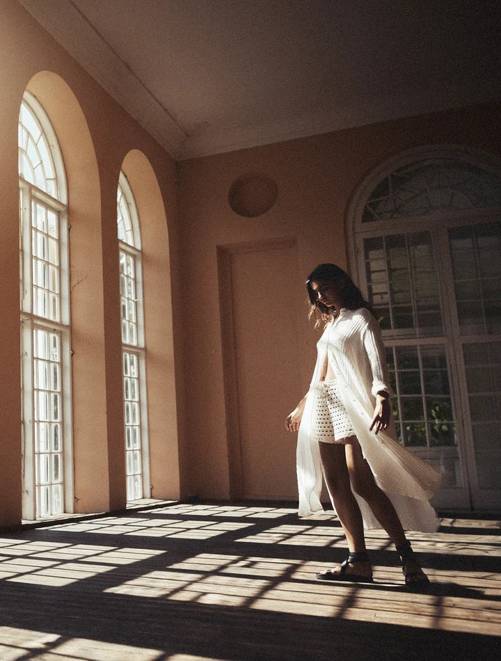 Deze lange jurk heeft een oversized pasvorm, lange mouwen die je makkelijk op kunt rollen. Door het zachte katoen materiaal draag je de jurk perfect op een warme zomerse dag.