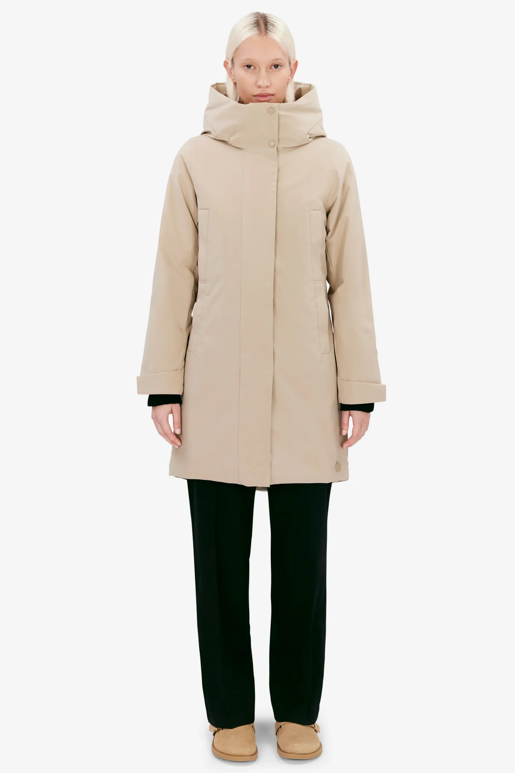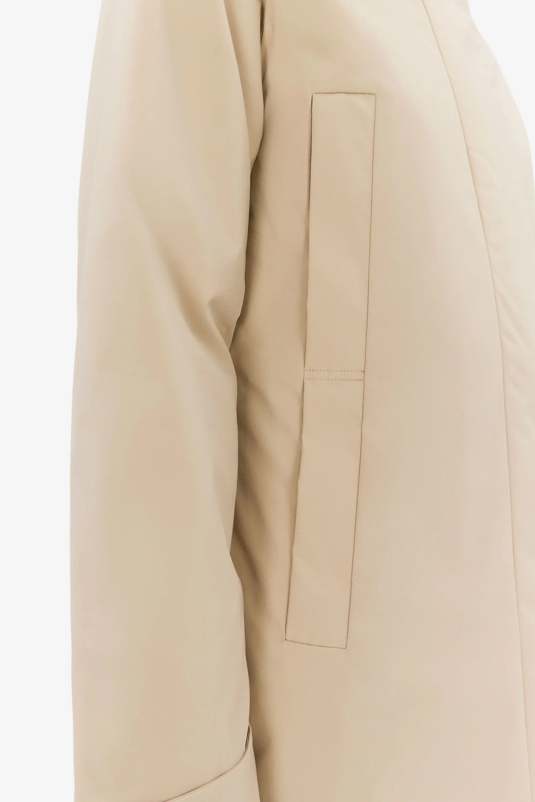 De ELINE jas voor dames van ELVINE is een jas met een slim-fit pasvorm. De jas is gemaakt van winddicht & waterafstotend materiaal. Daarnaast is de jas voorzien van een capuchon met elastisch trekkoord, kraag met drukknoopsluiting, rits aan de voorkant met magnetische klep en de vier zijzakken kunnen dicht via een ritssluiting. Ook hebben de uiteindes van de mouwen een verstelbare klittenband functie. Het materiaal van de ELINE voelt stevig aan met een lichte stretch en zacht matte afwerking.