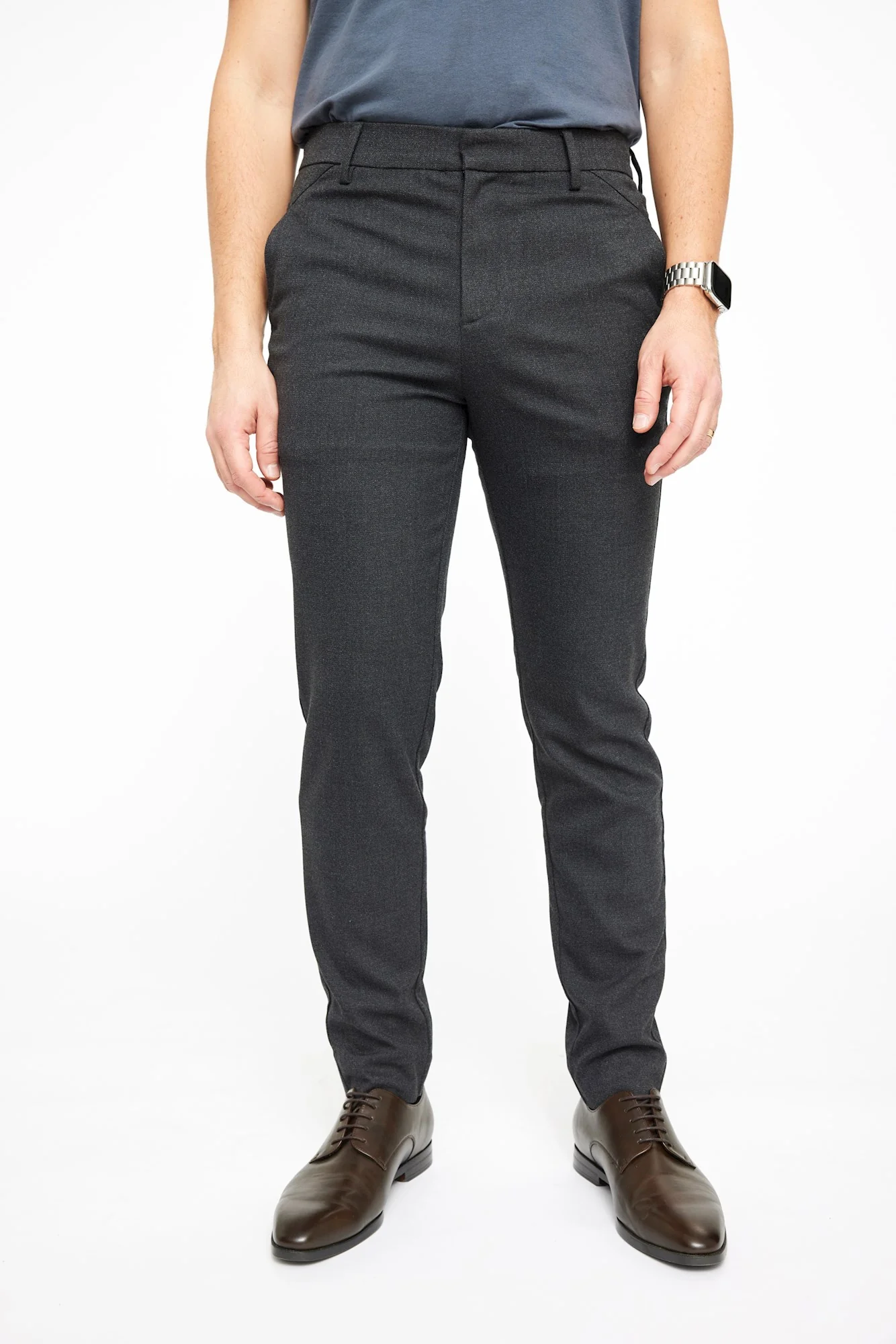 De Plain Josh 043 is een slim-fit tailored broek met een slanke pasvorm van boven naar beneden. De donkergrijze kleur en gemêleerd design geven de broek een klassieke uitstraling. Een mooi detail aan deze broek zijn de twee subtiele knoopjes aan de achterkant.