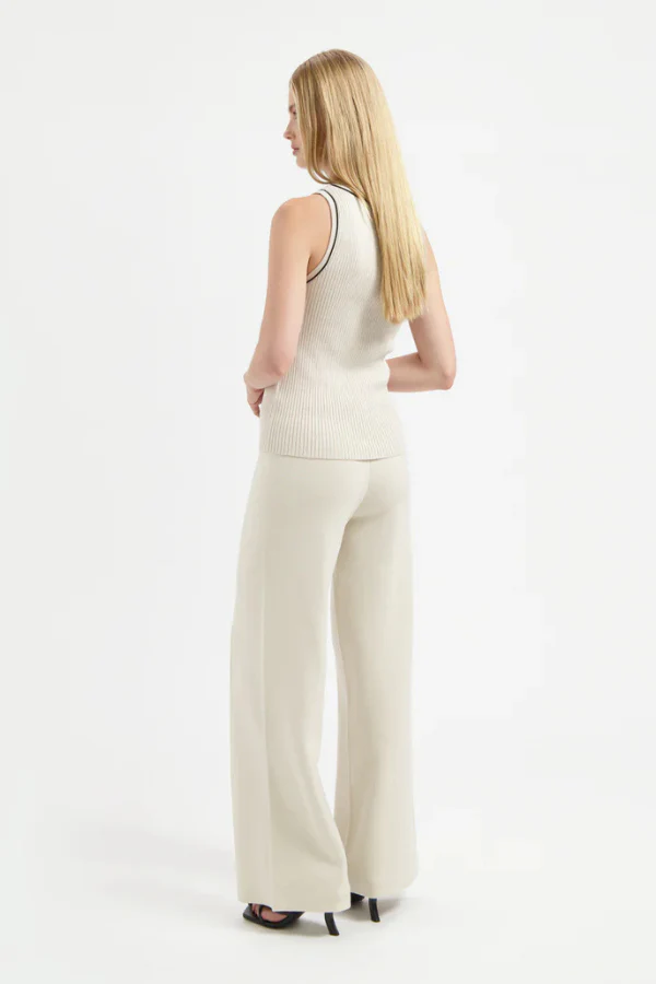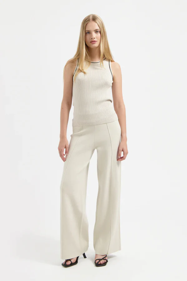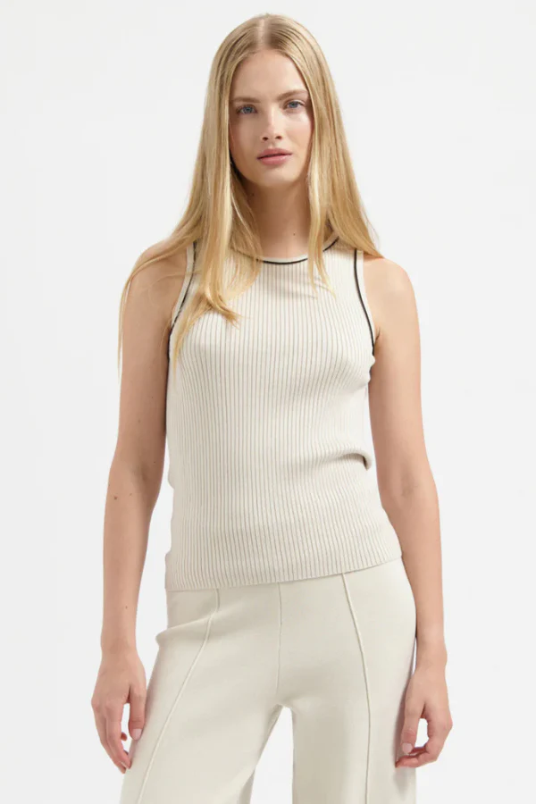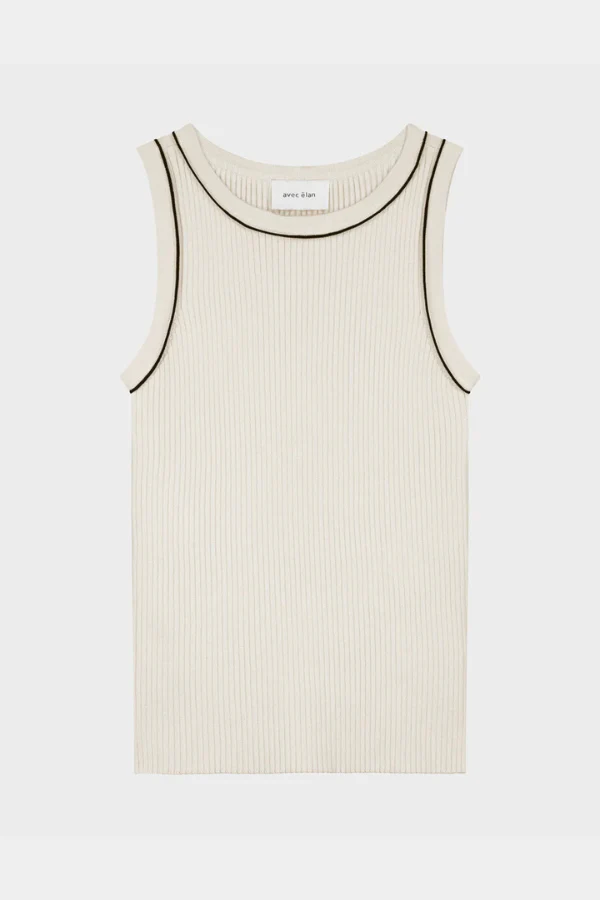 De JUUL TOP van AVEC ĒLAN is een mouwloze top met contrastbies en een ronde had. Een moderne essential met een verfijnde twist. De ribstructuur in een zachte mix van katoen en acryl zorgt voor een comfortabele stretch en een flatterende pasvorm. Draag de Juul solo op een jeans of onder een blazer voor een stijlvolle gelaagde look. Shop ‘m nu online!