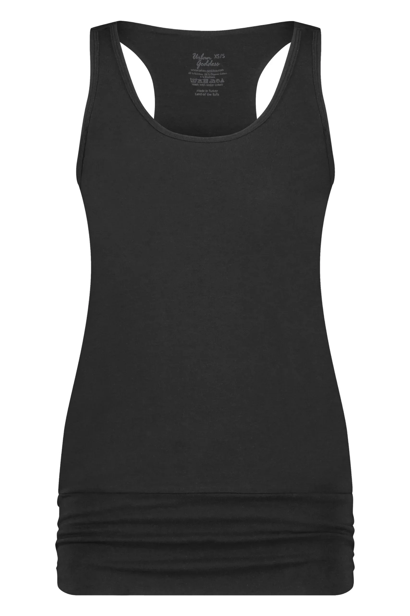 De Kami yoga tank is een stoere yoga top met hoge hals en heupband. Deze extra lange yoga top is geschikt voor yogini’s van alle lengtes. Je riskeert nooit een blote buik of koude onderrug tijdens de zonnegroet. Door de goed aansluitende heupband blijft deze lange yoga top goed zitten. De heupband heeft ook nog een mooi gerimpeld detail aan de zijkant.
