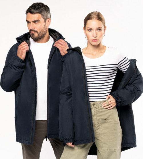 Een onmisbare bondgenoot in de winter. De Kariban Gerecyclede parka is gemaakt van een waterafstotende stof met een fluweelachtige afwerking voor een zachter gevoel. Het verlengde achterpand, de gevoerde capuchon en de gewatteerde binnenzijde zorgen voor een maximale warmte-isolatie. De Kariban Gerecyclede parka heeft 2 ritszakken aan de voorkant en een zak met klittenbandsluiting aan de binnenkant zodat je al je accessoires veilig kunt opbergen.