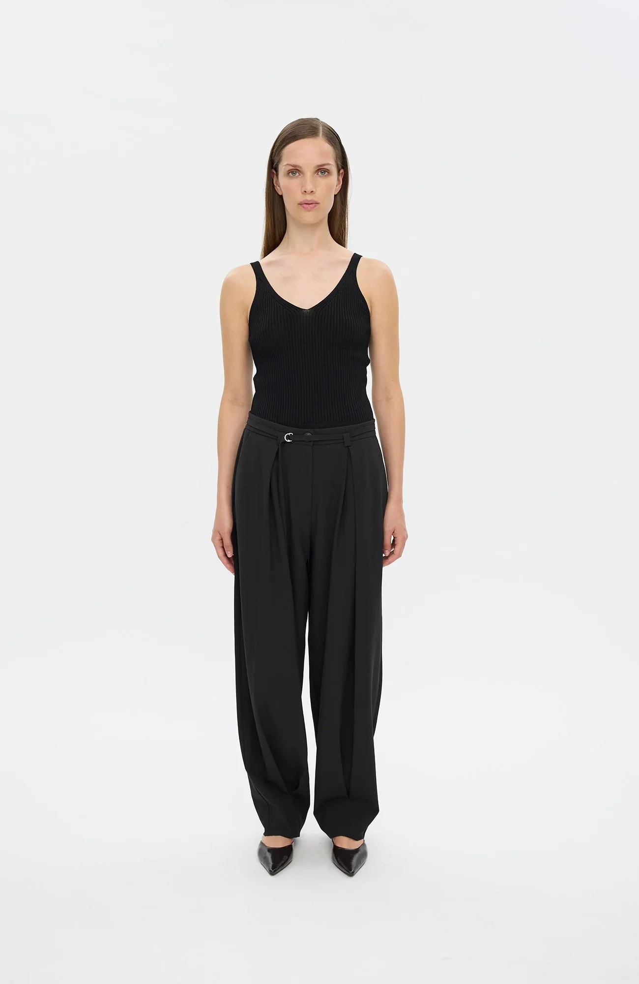 De LANAFV 285 BLACK van FIVE UNITS. Deze zwarte pantalon met high waist en elegante tapered fit is een moderne klassieker voor elke garderobe. Gemaakt van een comfortabele mix met 62% gerecycled polyester, viscose en elastaan, biedt de broek zowel structuur als bewegingsvrijheid. Combineer met een blouse of knit voor een effortless sophisticated look. Shop nu bij ANTRACITE!