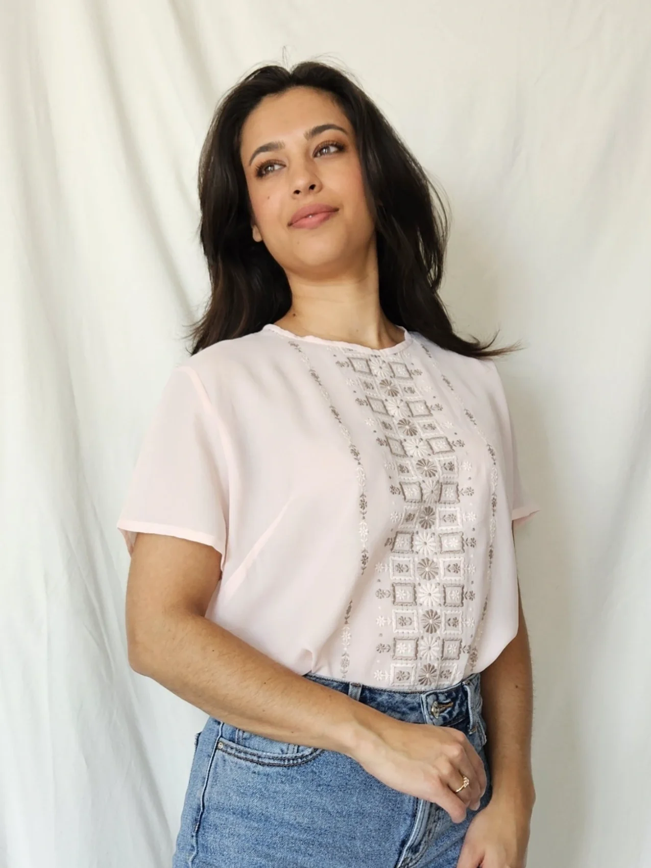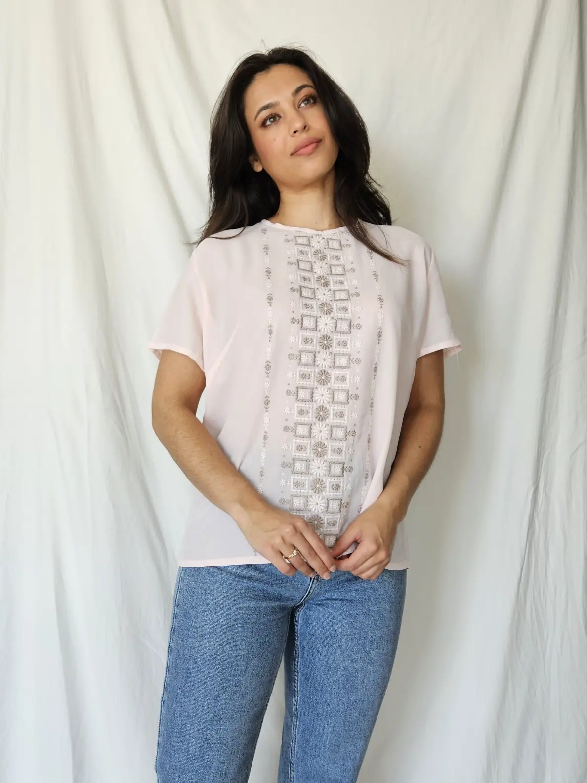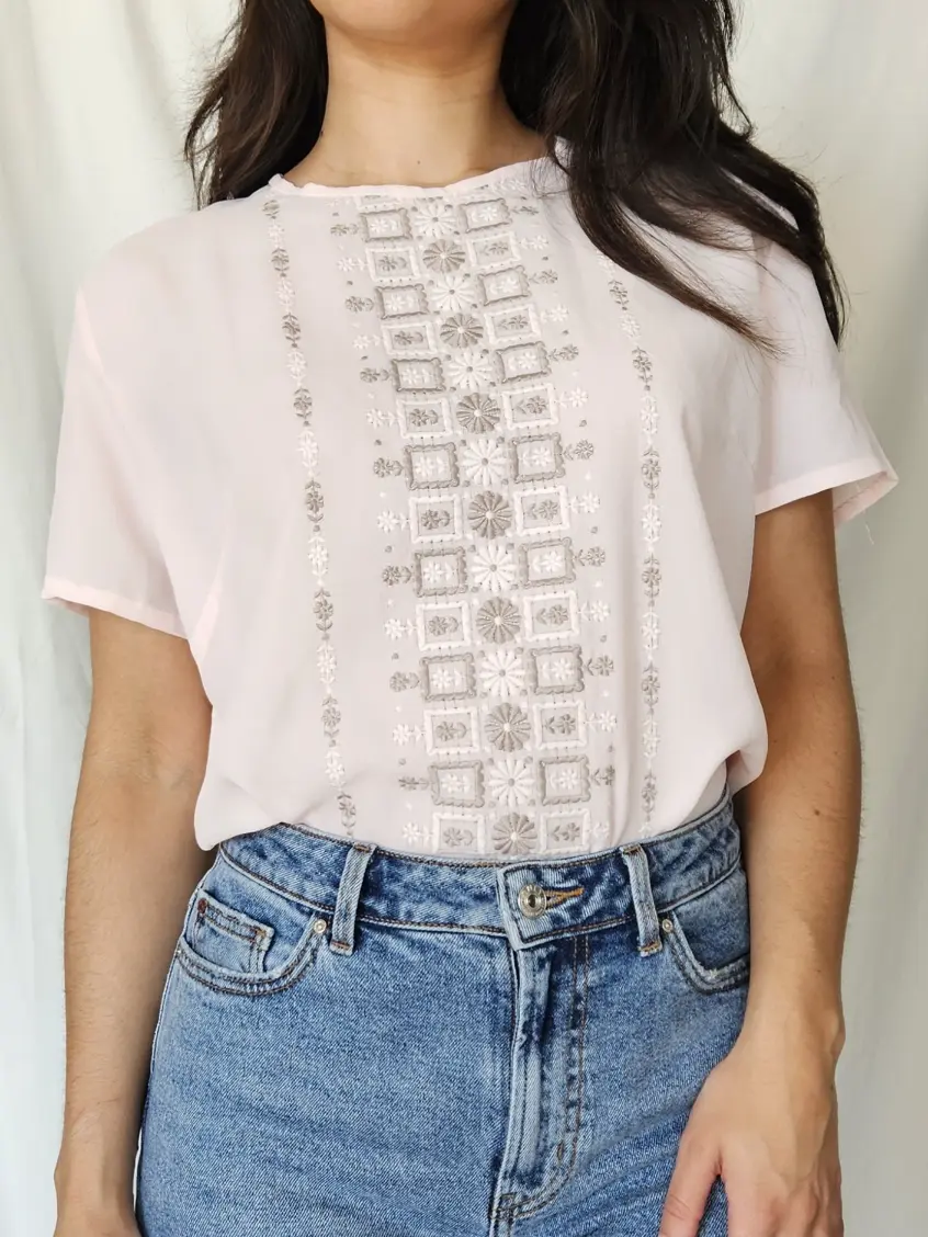 Ideale lichte zomer top die perfect te combineren valt. Deze top heeft een heel licht roze kleur en bevat grijze en witte geborduurde patronen aan de voorkant. Vergeet niet de achterkant te bekijken, want deze bevat mooie knopen van boven naar beneden.