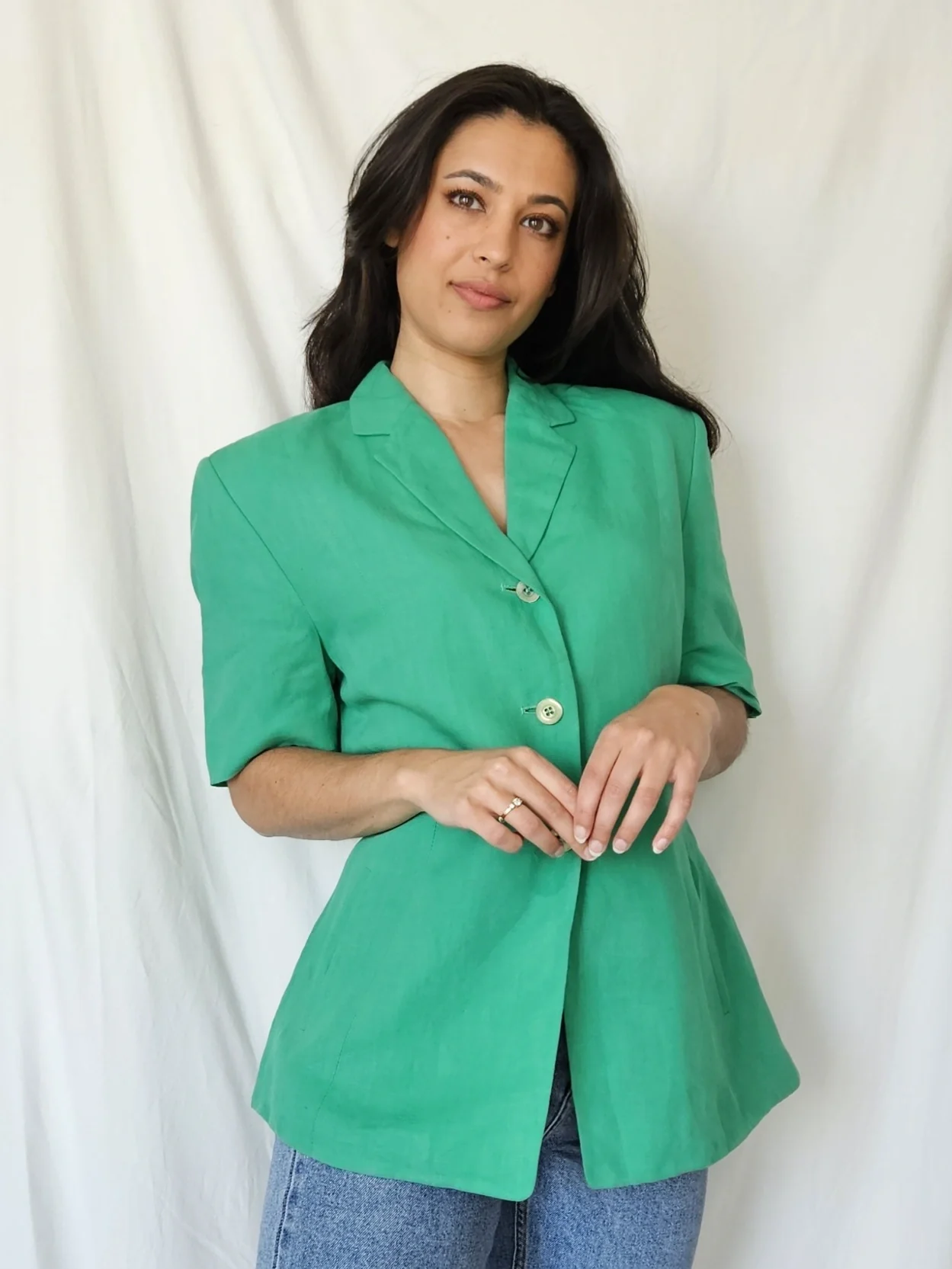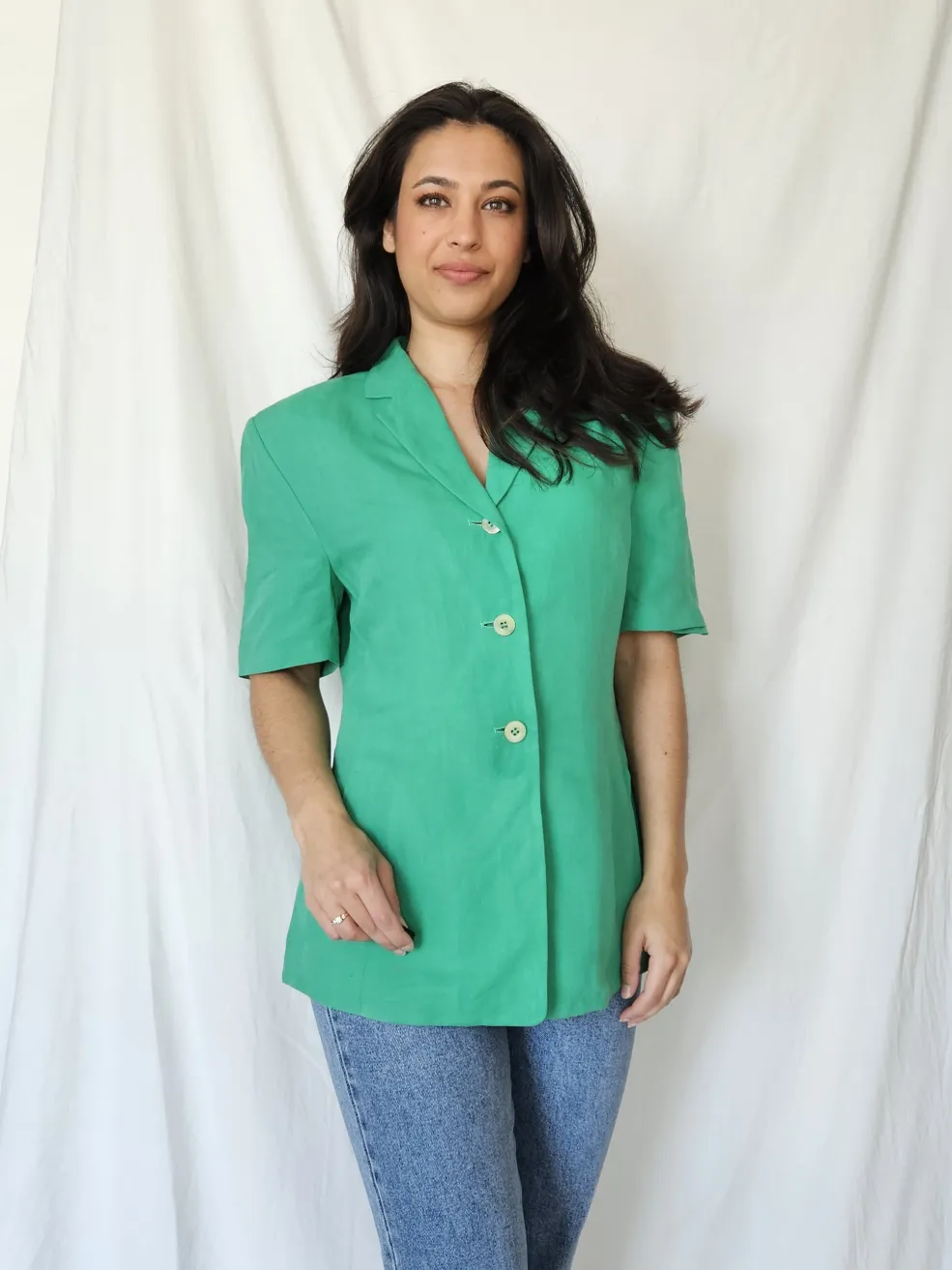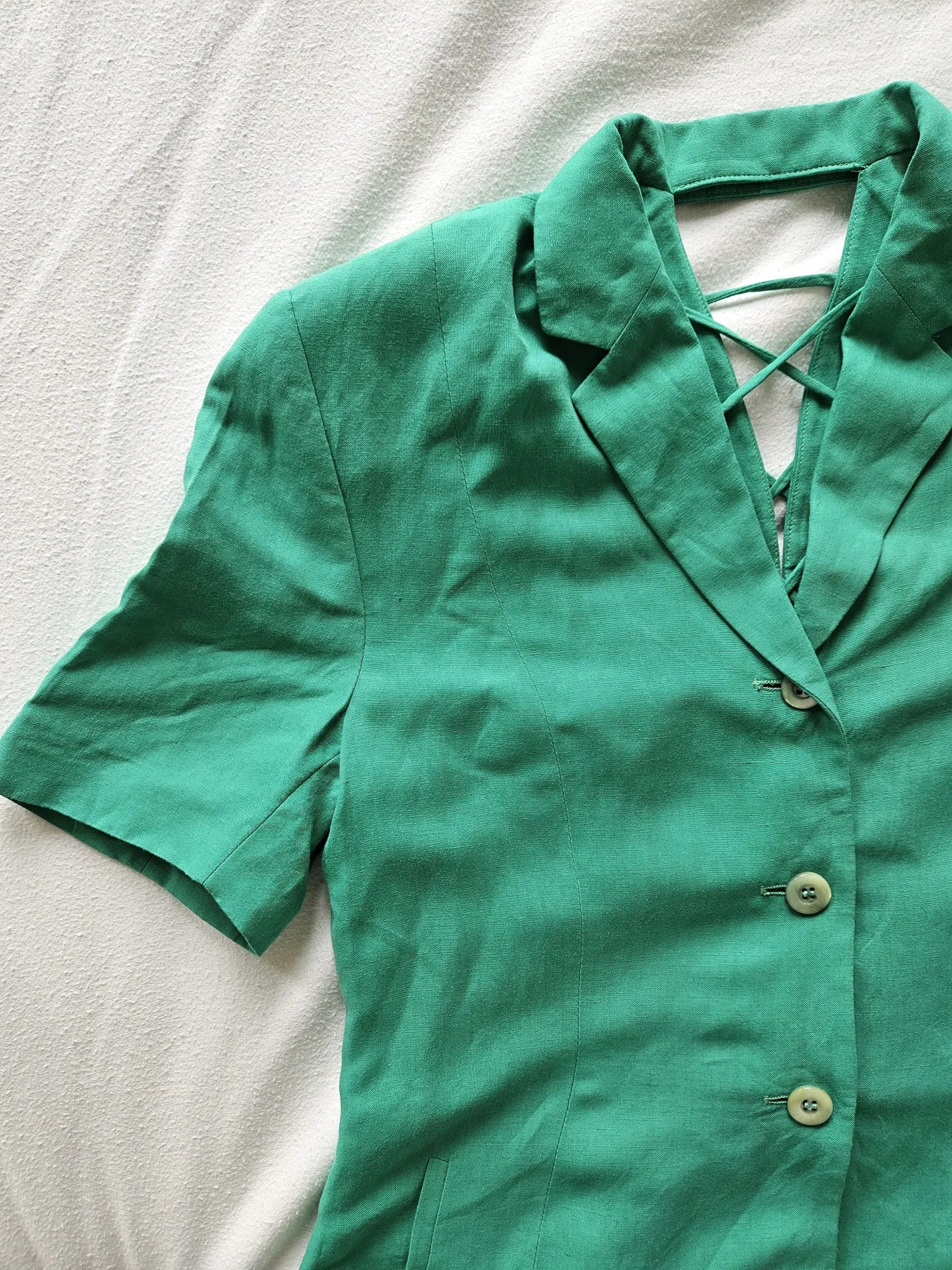 Vintage parel uit de jaren 80, een luchtige en kwalitatieve vintage top gemaakt van linnen en viscose in een prachtige groene kleur. Heb je de achterkant ook al gezien? Dit is het vintage antwoord op de strikjes trend die je overal ziet. De top bevat schoudervullingen.