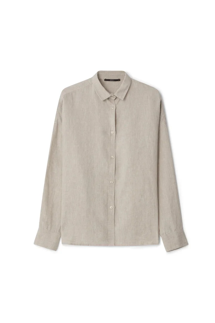 Deze blouse van AVENY heeft een normale tot oversized pasvorm, een knoopsluiting aan de voorkant en lange mouwen die je op kunt rollen. De De blouse is gemaakt van linnen materiaal.