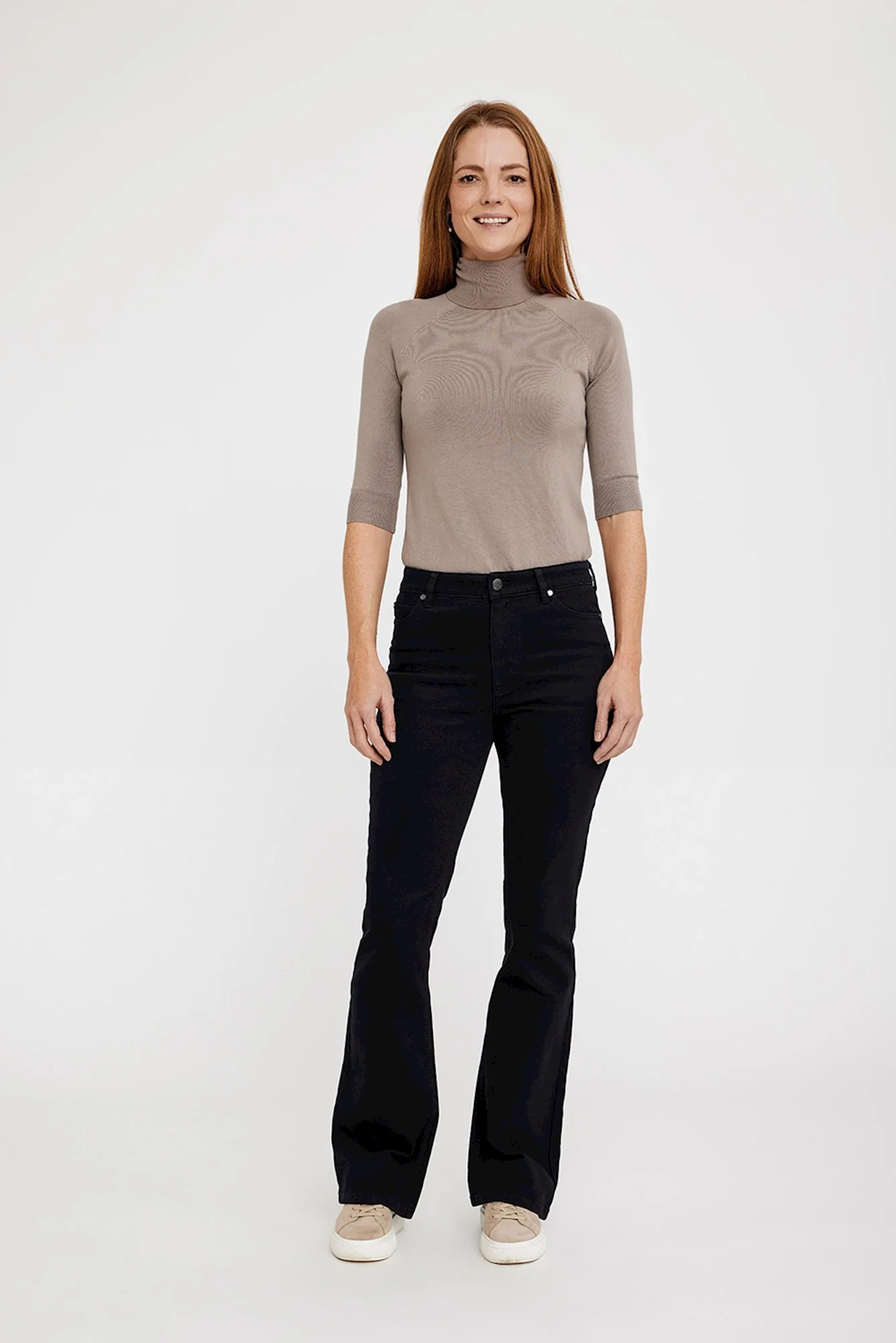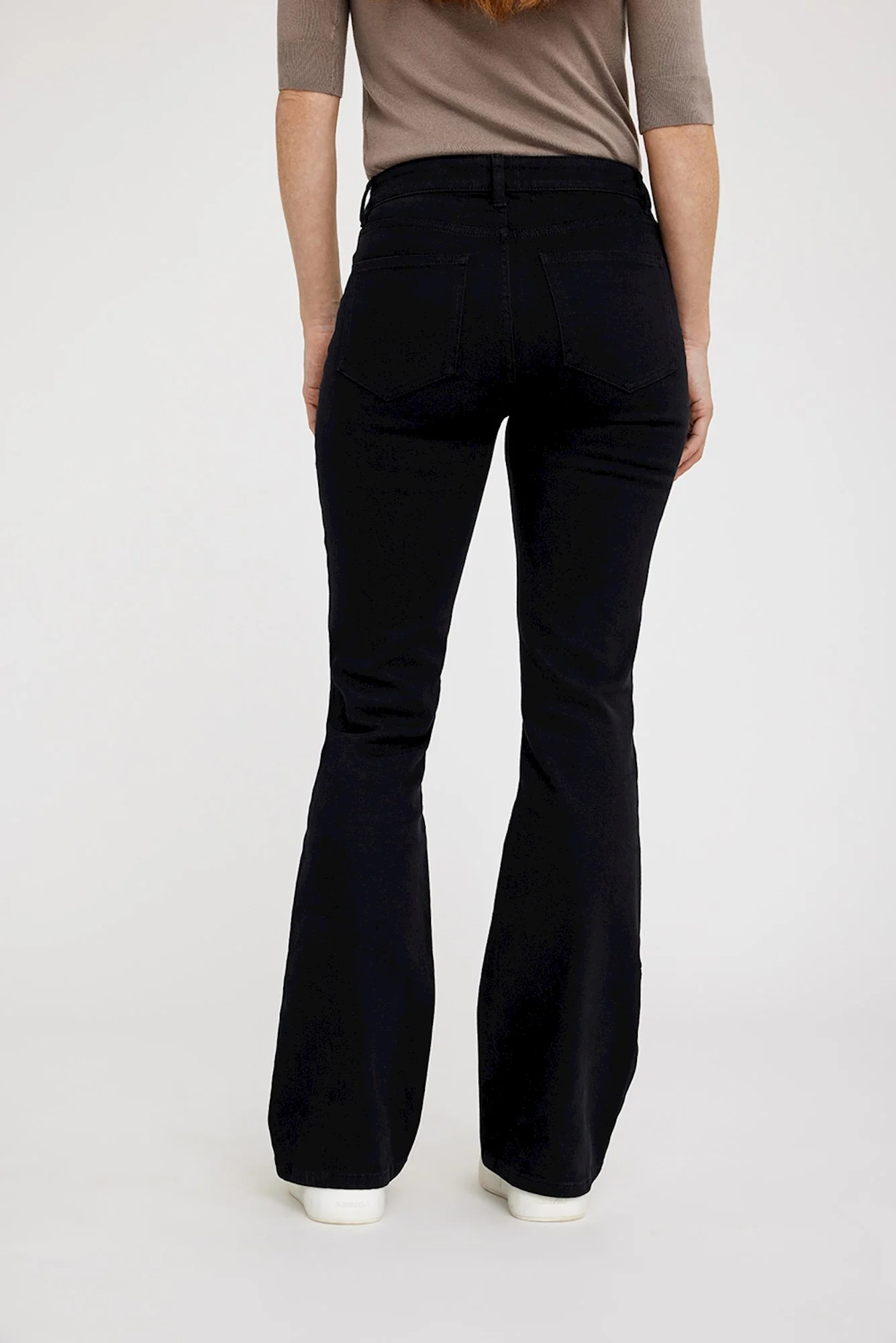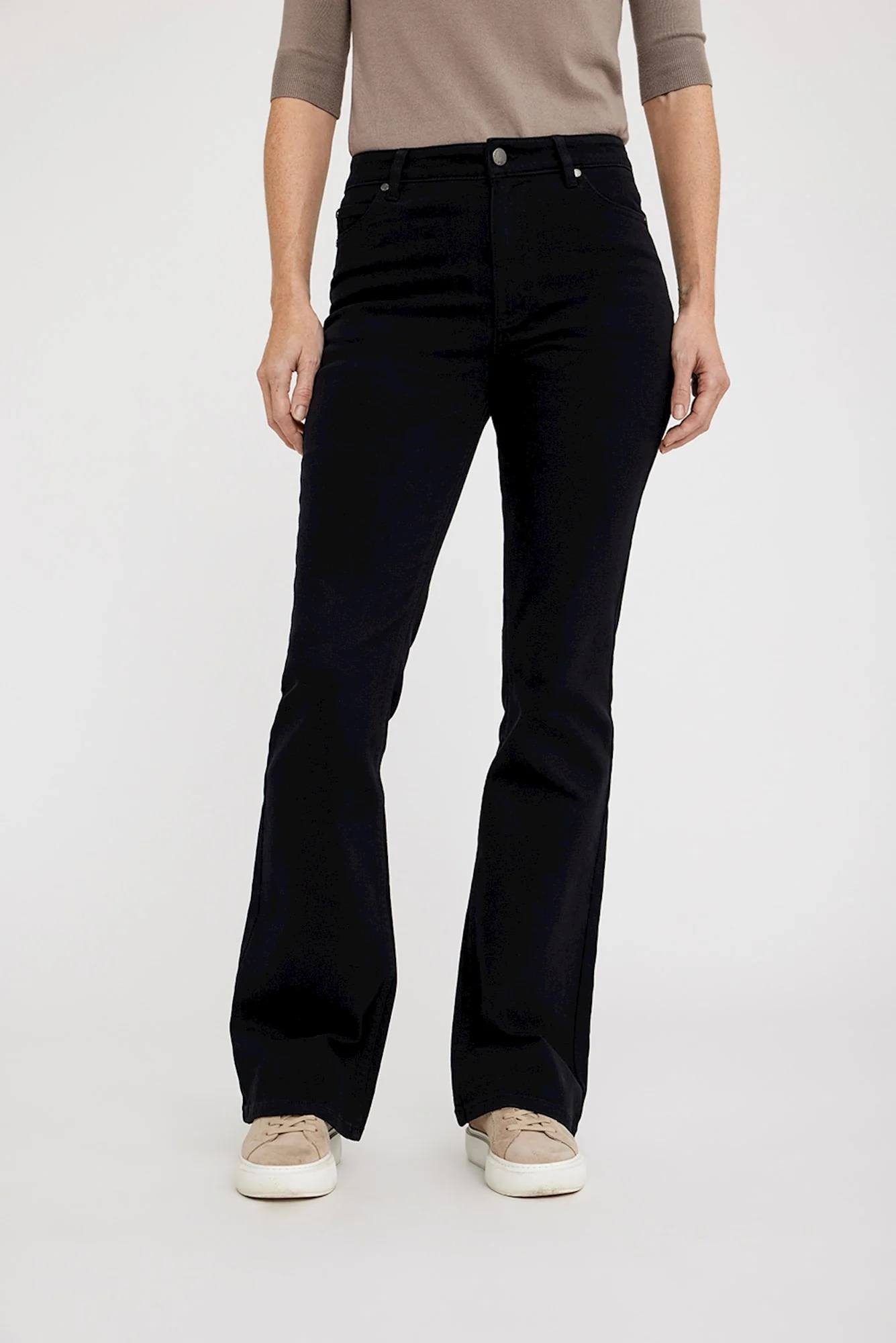 - Mid-high waist, wijd uitlopende pijpen, normale lengte