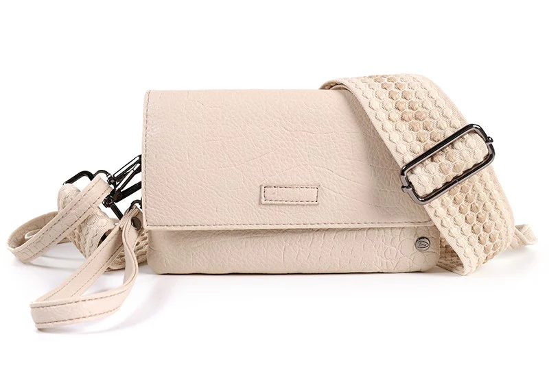 “NEW” crossbody- schoudertasje Bussum, eenvoud siert dit prachtige tasje met een lichte croco print. Bussum heeft twee aparte vakken een afgesloten met een ritsje en een afgesloten met een fraaie flap zeer geschikt voor elk formaat I-phone.