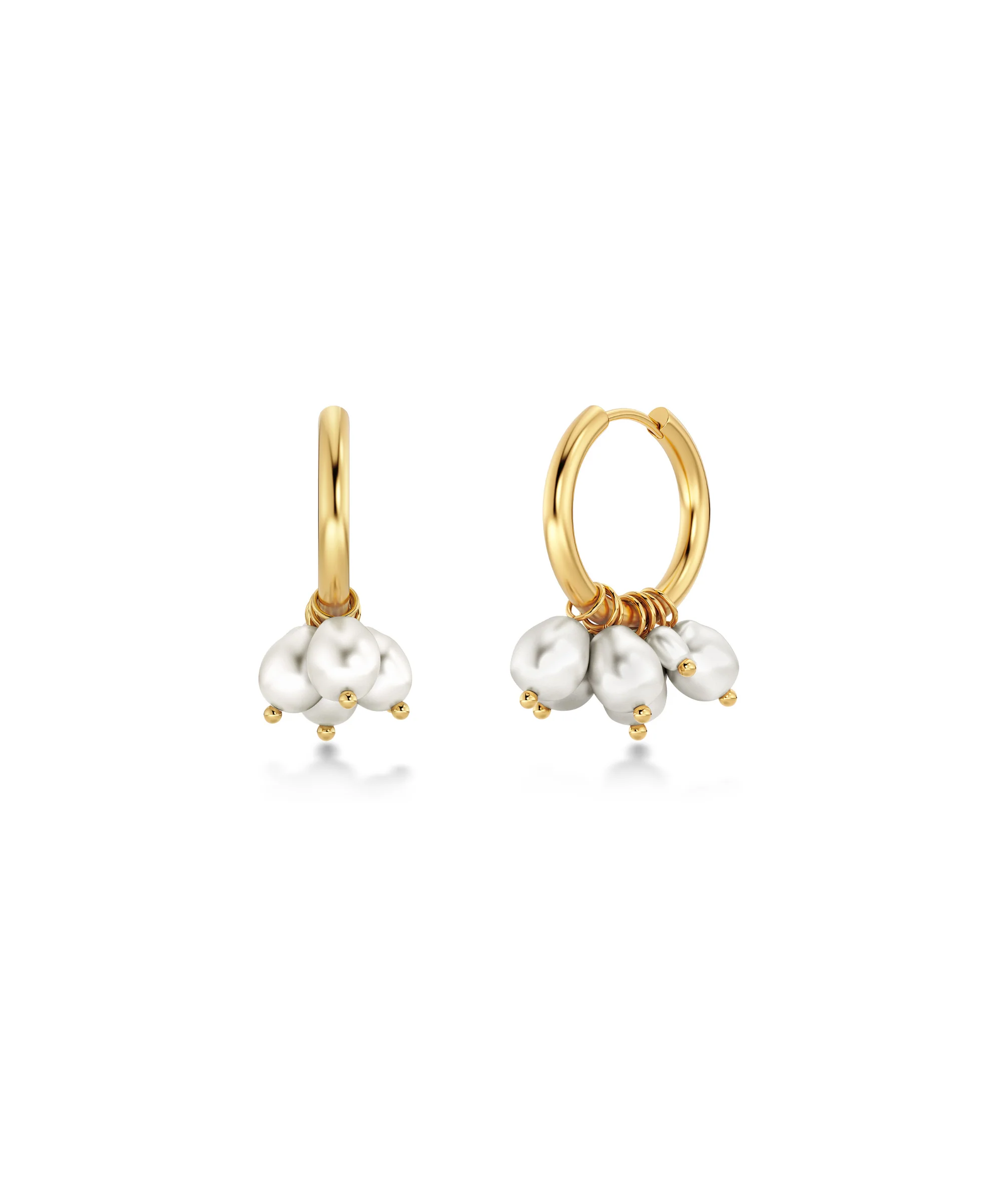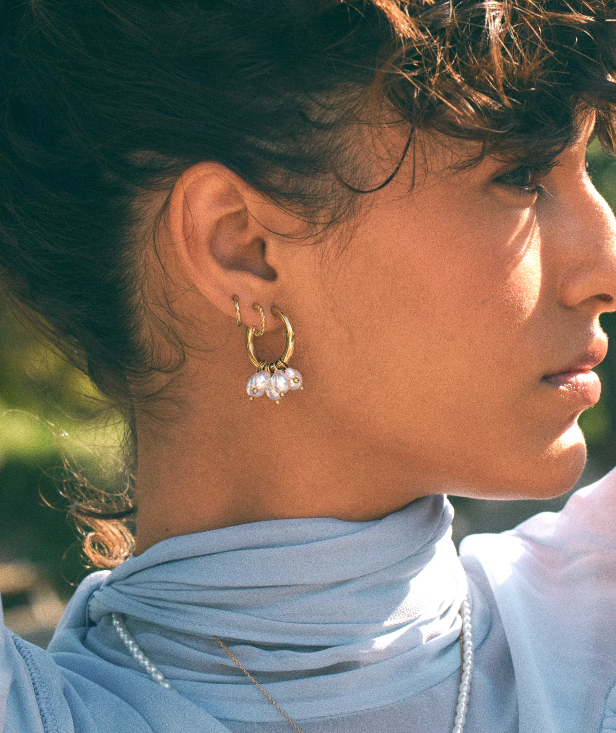 De Pearl Signet Hoops combineren glanzend metaal met de delicate schoonheid van parelmoeren parels, geïnspireerd door de eerste lenteknoppen. Deze romantische oorringen zijn perfect voor wanneer je je van je zachtere kant wilt laten zien. De 14K vergulde cirkel wordt versierd met acht parels in twee verschillende groottes, die in clusters aan de onderkant hangen en samen een mooie, subtiele beweging creëren. De parelclusters zijn afneembaar, zodat je de oorbellen kunt aanpassen aan je stijl en stemming.