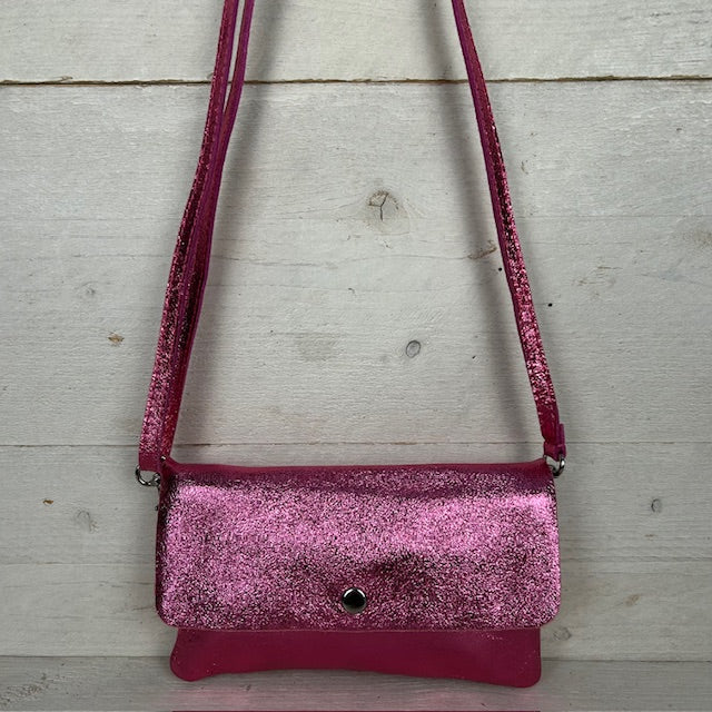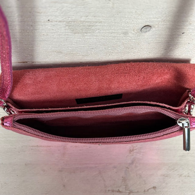 Super leuk metallic tasje van real leather. Het tasje heeft drie vakjes waarvan één met ritssluiting en een verstelbare band.