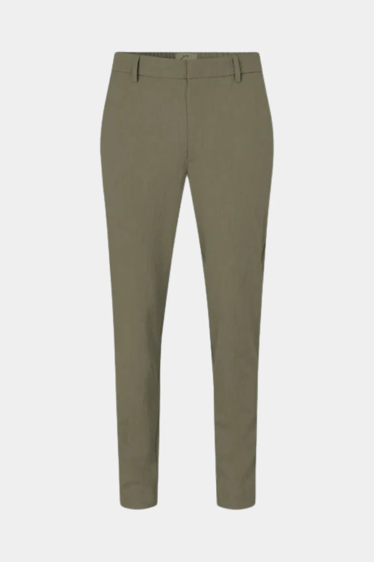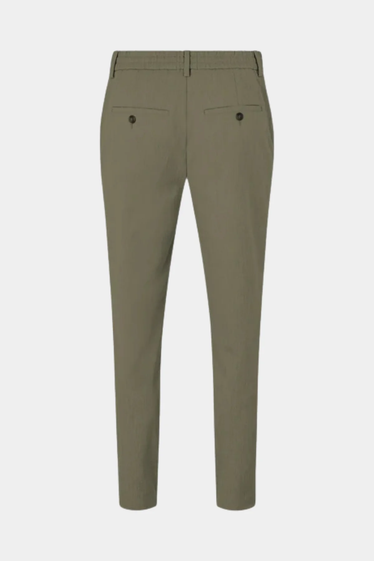 De THEOPL 805_GRS van PLAIN is een moderne tapered pantalon met mid‑waist en normale lengte, ontworpen in Kopenhagen en vakkundig vervaardigd in Turkije . De stof is een dicht geweven dessin‑805 twill mix van 62 % gerecycled polyester, 33 % viscose en 5 % elastaan, wat zorgt voor duurzame structuur, zachte pasvorm en subtiele stretch. Kenmerkende details zijn de schuine steekzakken voor, paspelzakken achter, een verborgen haak‑en‑oogsluiting én een elastische achterzijde voor optimaal draagcomfort — perfect voor zowel casual als zakelijke looks. Combineer ‘m met een klassiek overhemd en loafers voor een moeiteloos stijlvolle en comfortabele outfit.