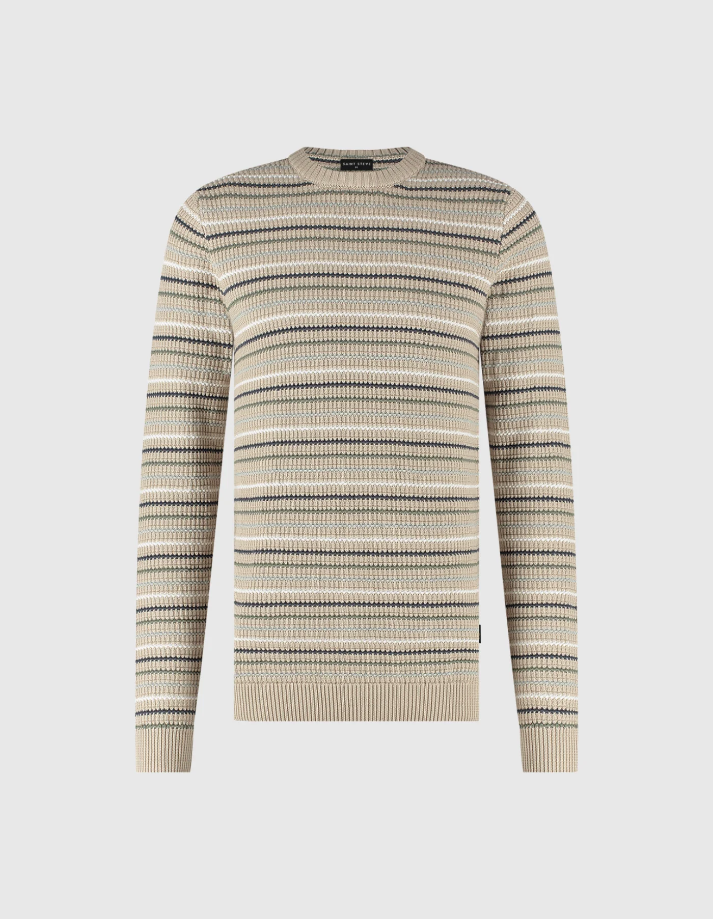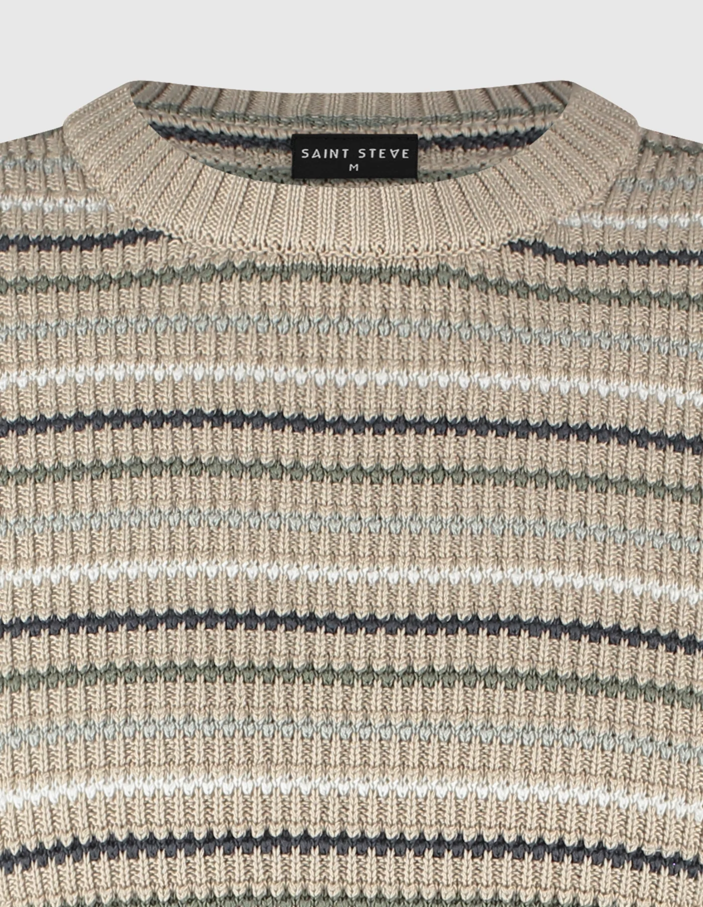 Ga voor een vernieuwde look met de TIM van SAINT STEVE. Deze trui, gemaakt van 100% hoogwaardig katoen, heeft een normale pasvorm en een gestreept design met een subtiele wafelstructuur. Perfect te combineren met een pantalon of jeans voor een stijlvolle en veelzijdige outfit.