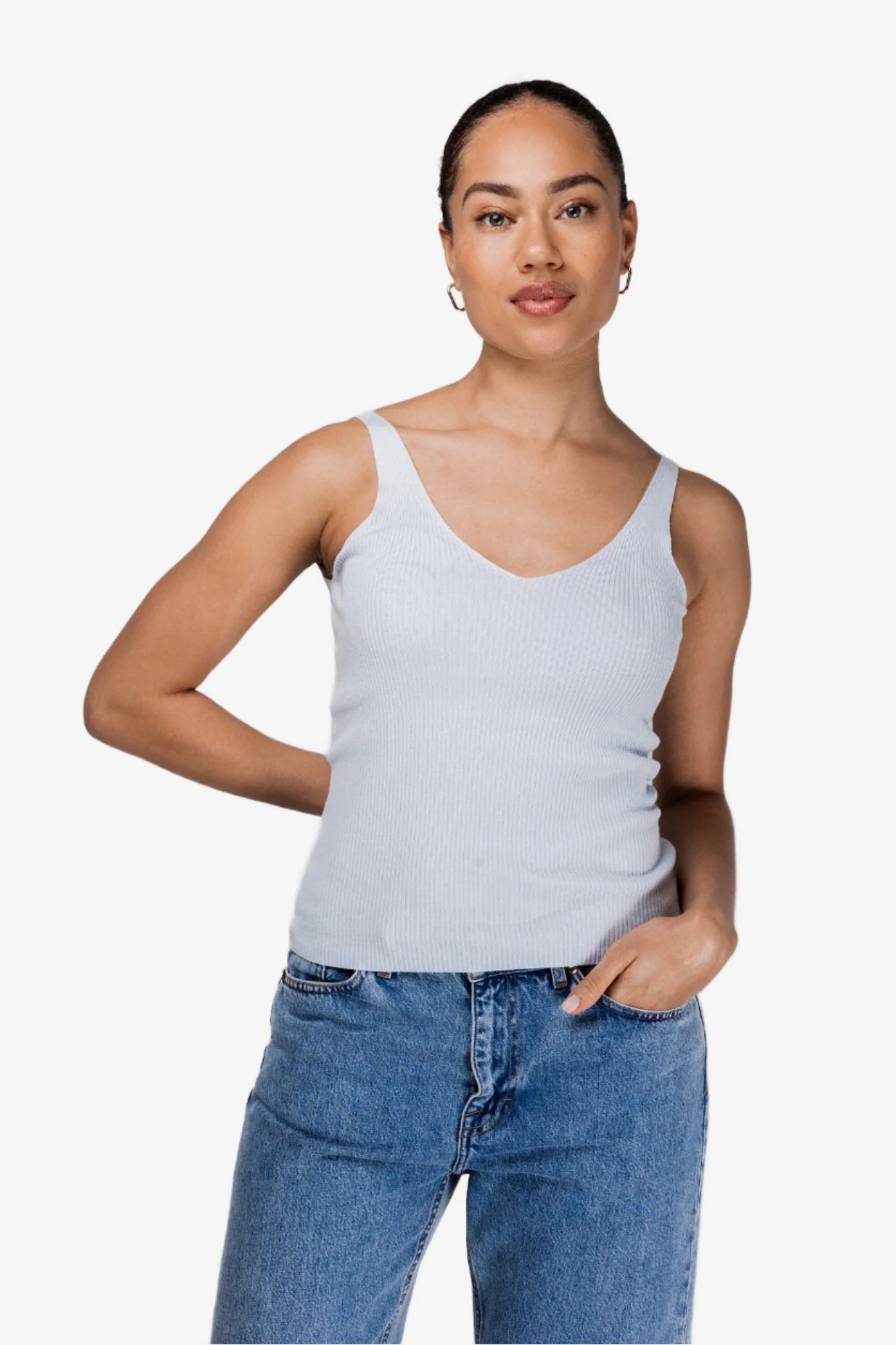 De VIVIAN is een must have top om aan jouw zomergarderobe toe te voegen. Het is een top met klassieke details zoals de V-hals aan zowel de voorkant als de achterkant, de subtiele rib en dunne schouderbandjes. Creeer een perfecte zomerse look en combineer de top met een linnen short van FIVEUNTIS.