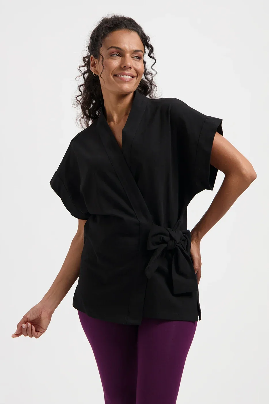 De Yumea Kimono Yoga Top is een moderne kimono met wijde mouwen, diepe overslag en lange tailleband. Gemaakt van biologisch katoen met lycra – zacht, sterk en super stijlvol. Draag het als wrap-top voor yoga, meditatie of als loungewear.