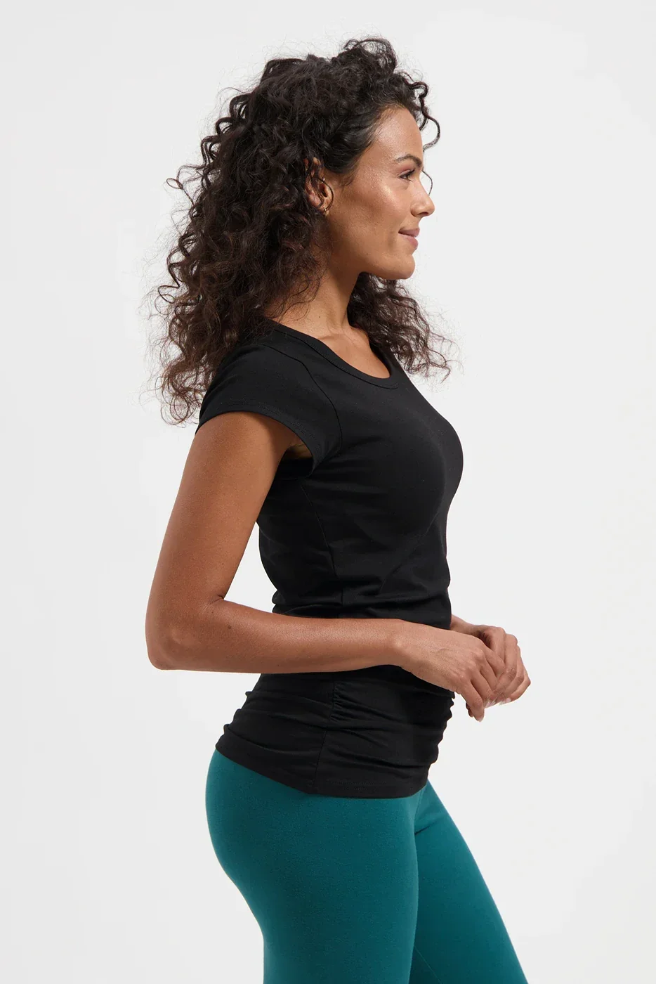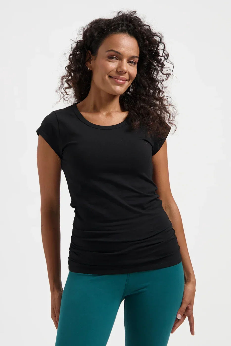 De Zefira Yoga Tee in Onyx Black is jouw nieuwe go-to. Gemaakt van biologisch katoen met lycra voor ultieme zachtheid en stretch. De subtiele plooitjes aan de zijkanten zorgen voor een relaxte, flatterende fit – perfect voor op de mat of als comfy everyday wear.