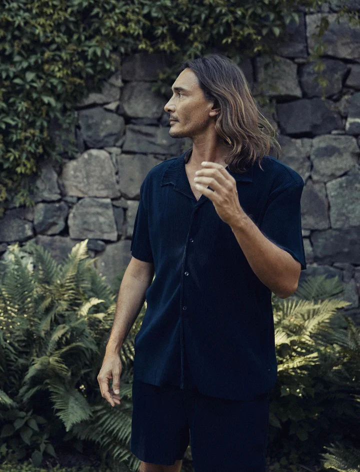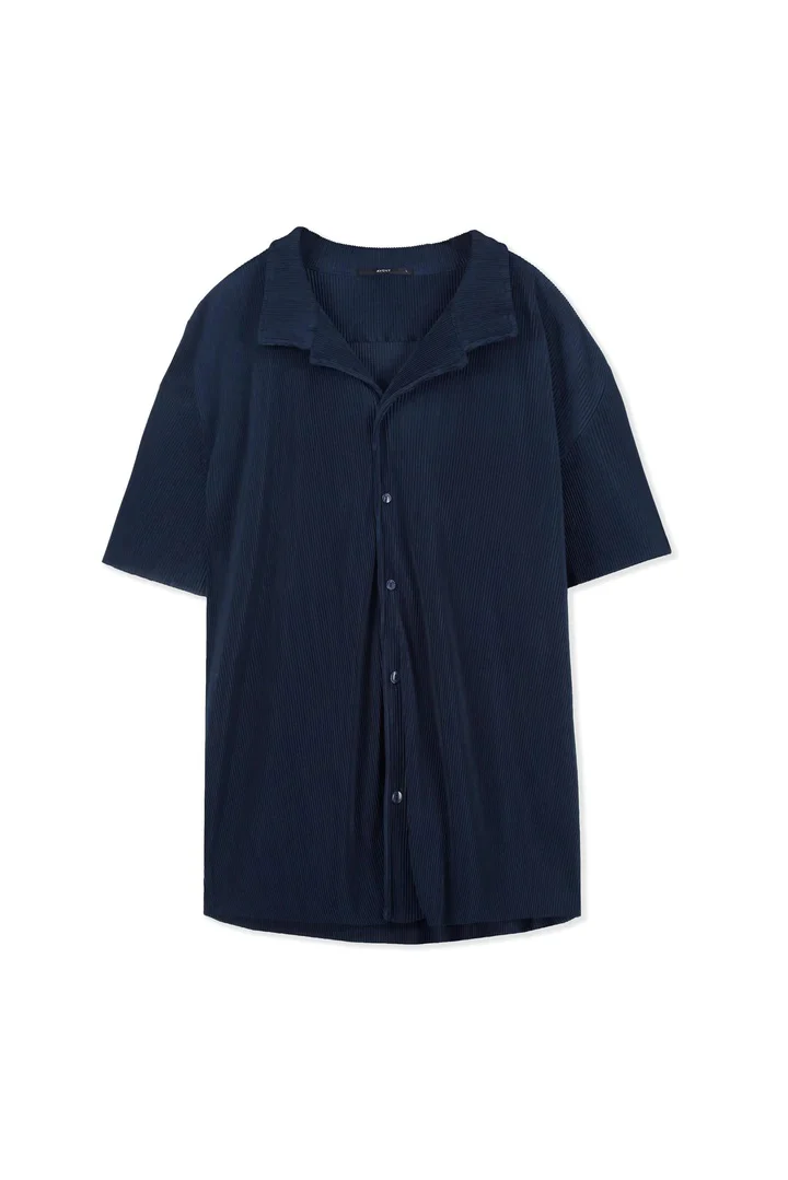 Dit donkerblauwe shirt voor heren heeft een platte kraag, korte mouwen en knoopsluiting aan de voorkant. Het shirt heeft een plissé ribstructuur. Daarnaast heeft het shirt een normale pasvorm en draag je het perfect naar een dagje strand of avondje uit.